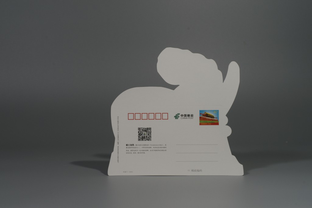 该款霸王龙明信片是gb28365-2012首次与中国邮政集团合作的异形邮资片,正面的霸王龙卡通骨骼形象一改霸王龙凶猛的特征,背面有天安门图案的邮资票面。不用另购邮票即可邮递,我馆设有专用邮筒可供观众邮递,正面图案后期会陆续开发。