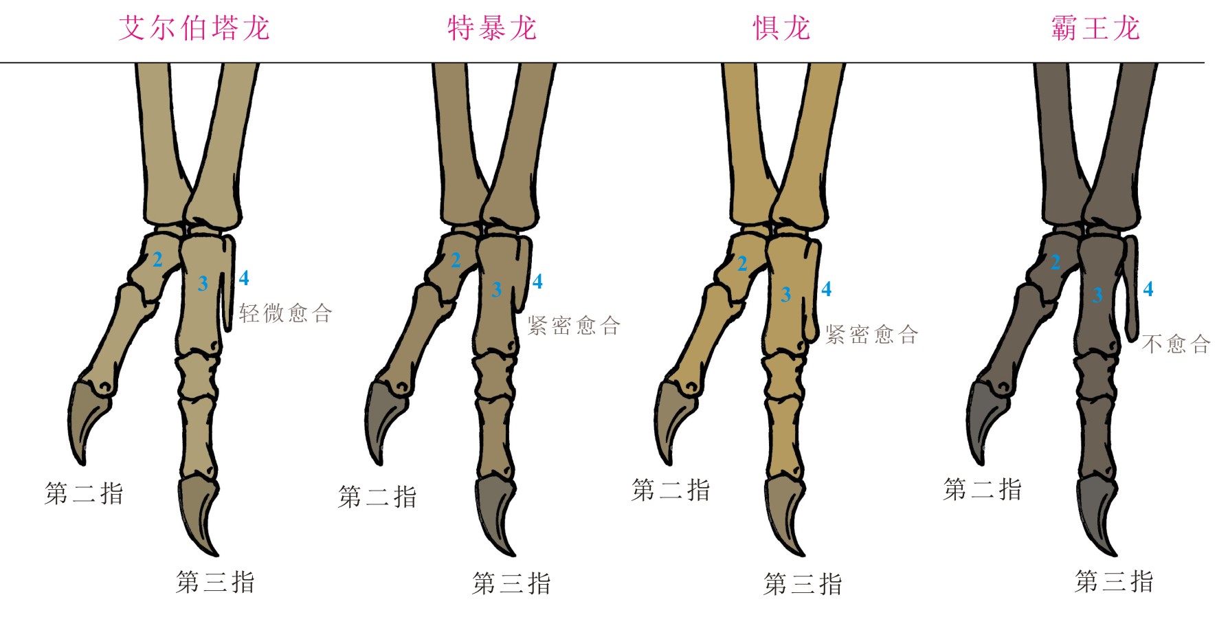 图3 霸王龙和其近亲的第三和第四掌骨愈合情况