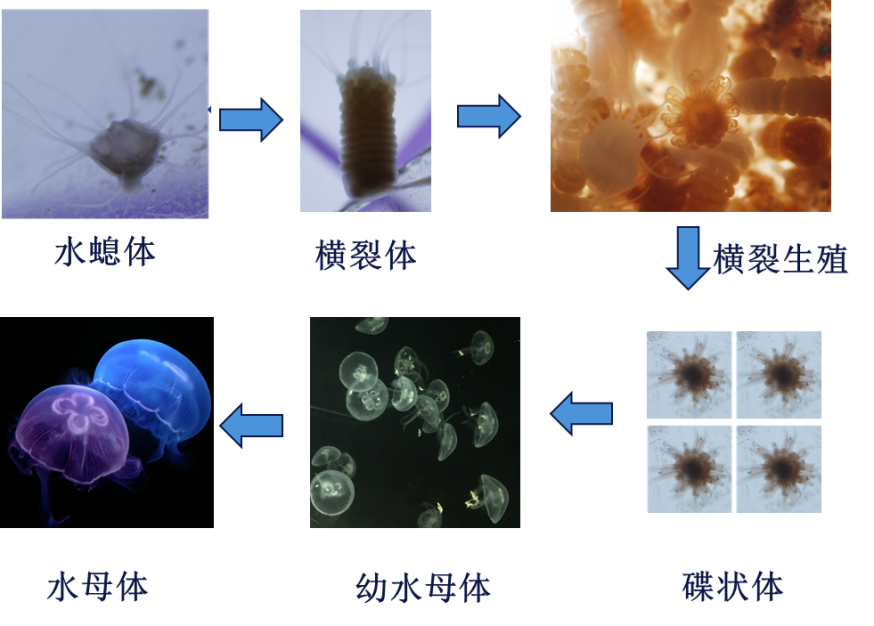 在一定的环境条件下,螅状体的躯干部开始拉伸,并形成一个个的缢痕,这些缢痕进一步发育成裂节状,裂节逐渐长大最终长成小碟子样一个个摞在一起。这时候的螅状体成为横裂体,因为它正在进行横裂生殖。横裂体进一步发育,其顶端的触手消失,其上的小碟子具有抖动能力,通过不断抖动,小碟子依次从横裂体上脱落下来,成为碟状体。通过一次横裂生殖, 1 个海月水母螅状体可以产生数量不等的碟状体。在碟状体全部脱落后,横裂体的顶端重新长出触手,变成螅状体。而脱落螅状体的碟状体逐渐长大成幼水母体, 幼水母体历经约 5 个月的时间,发育成性成熟的水母体,随后产卵,释放浮浪幼虫、死亡 ,这样海月水母就完成了它的一生。