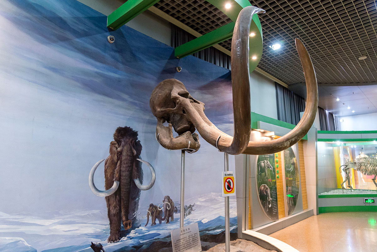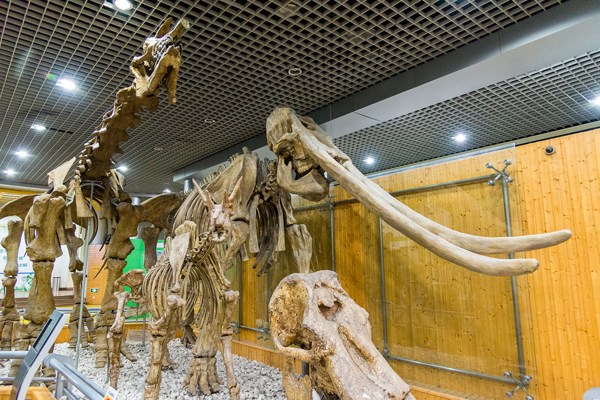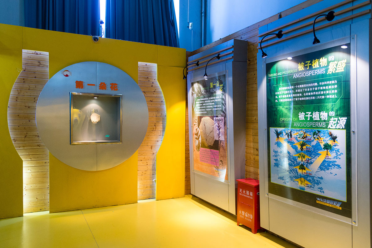 在展厅中,观众可以看到阶齿兽的复原图和骨骼标本,它是恐龙绝灭后地球上同期最大的哺乳动物;可以欣赏到庞大的象类家族,包括赫赫有名的高4米长8米的黄河象和铲齿象。观众还可以欣赏到一件十分引人注目的标本:目前最早的被子植物化石——世界上第一朵花辽宁古果。