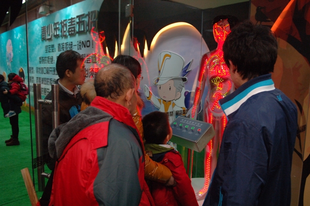 此展览共分“认识毒品”、“毒品危害”、“家庭防毒”、“毒情形势”、“法律法规”和“互动展示”六大板块。展览形式丰富,手段多样,有模拟吸毒者空间错觉的体验区,有直观的人体器官损害对比,还能够听到被毒品伤害后心脏悸动的声音。在互动区还有可以自拍和合影的立体卡通人物,主办方还特意制作了新奇的小奖品,只要将参观展览的照片上传至朋友圈就可以免费领取。