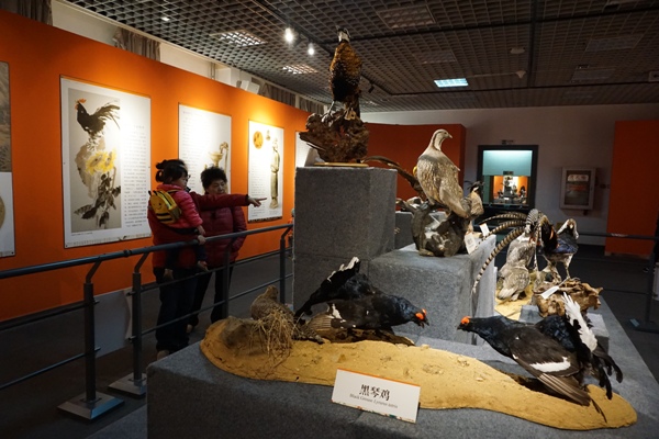 “金鸡报晓”展览展品共计57件,包括阿尔泰雪鸡、白冠长尾雉、红腹锦鸡等精美展品。该展览主要以2017年农历生肖鸡年作为创作背景,从自然科学和民俗文化等角度进行扩展和延伸,以标本和图片为载体,将生肖鸡的形象生动地呈现在公众面前。